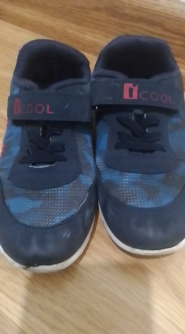 Koyu mavi bağcıksız, cırt cırtlı erkek çocuk spor ayakkabısı, lastik tabanlı ve batik desenli. Sokak stiline uygun.
