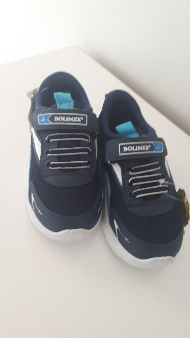 Bu erkek çocuk spor ayakkabısı, renkli mavi ve baskılı detaylara sahip, kolay kapanan velcro bantlıdır. Kauçuk tabanlıdır ve streetwear tarzına uygundur. Marka adı Bolimex bantta yer alır.