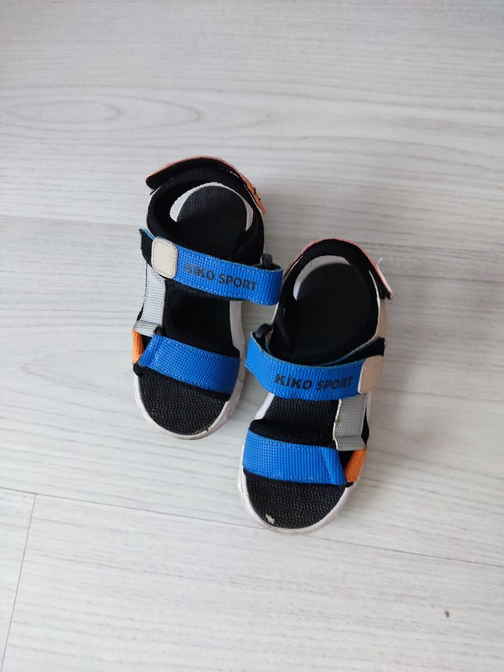 Mavi renkli, renkli baskılı desenlere sahip erkek çocuk spor sandaletleri. Kauçuk tabanlı ve ayarlanabilir Velcro bantlıdır.Çok az ve temiz kullanıldı.Işıkları sağlamdır.