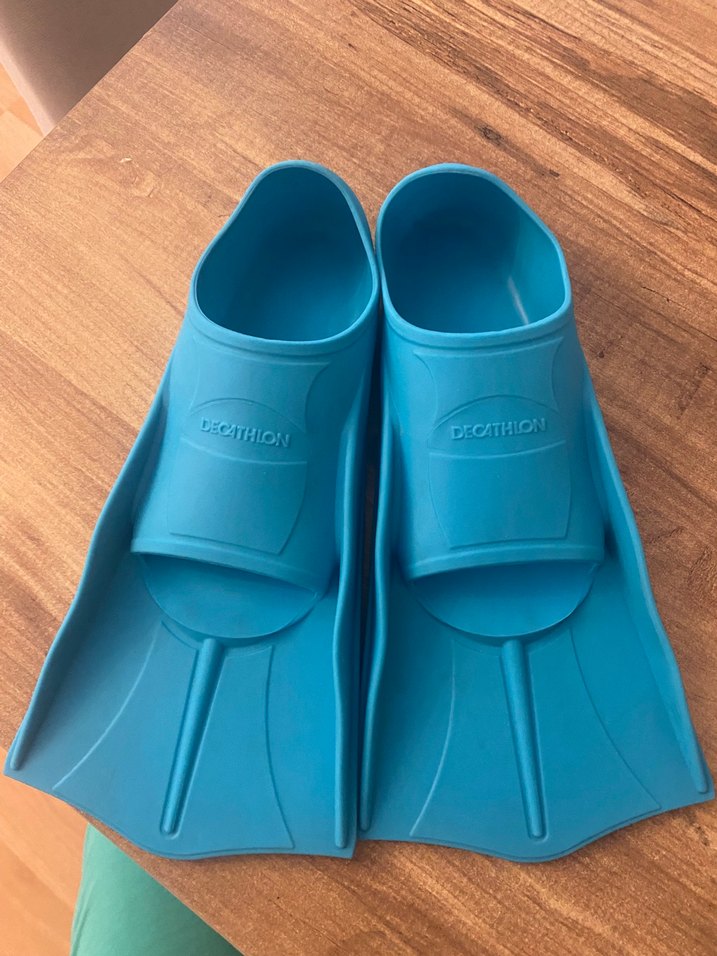 Mavi renkte, kauçuk malzemeden yapılmış, Velcro kapamalı erkek cocuk su ayakkabısı. Plaj kullanımı için uygun, desensiz ve renkli görünümlü. Decathlon markası.
