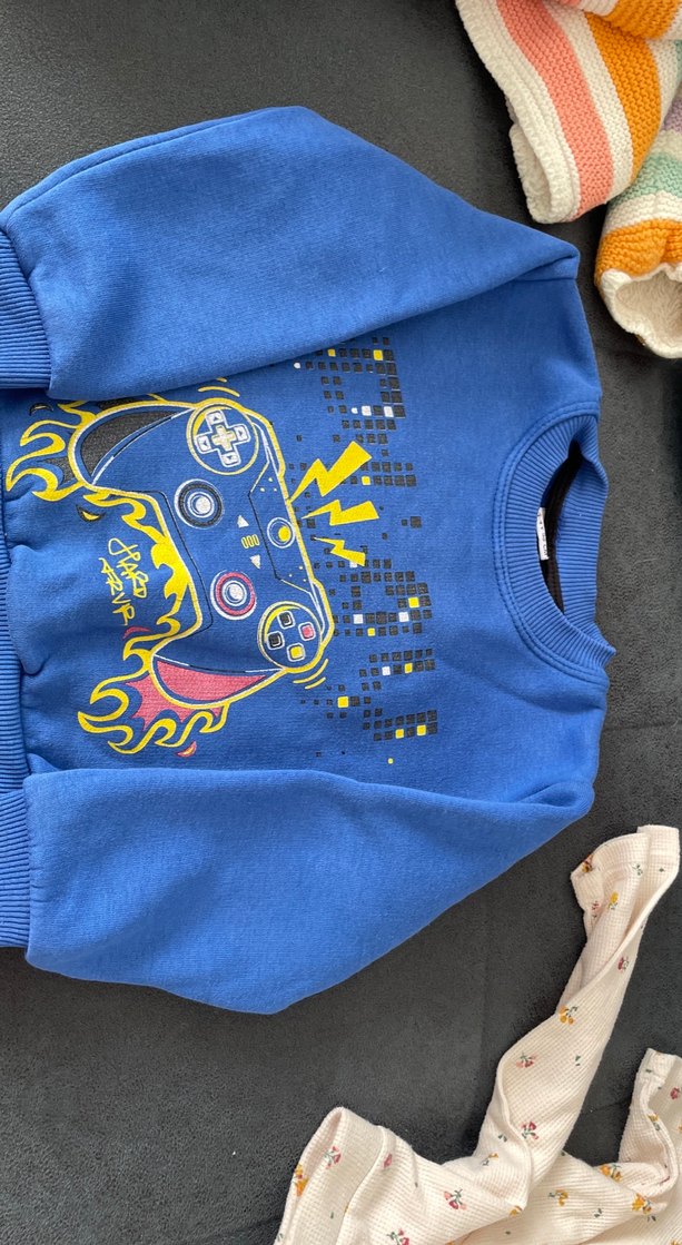 Renkli oyun kumandası baskılı, yumuşak ve sıcak kumaştan mavi erkek çocuk sweatshirtü. Bisiklet yaka, uzun kollu, cırt cırt detaylı, bol kesim tarzında.