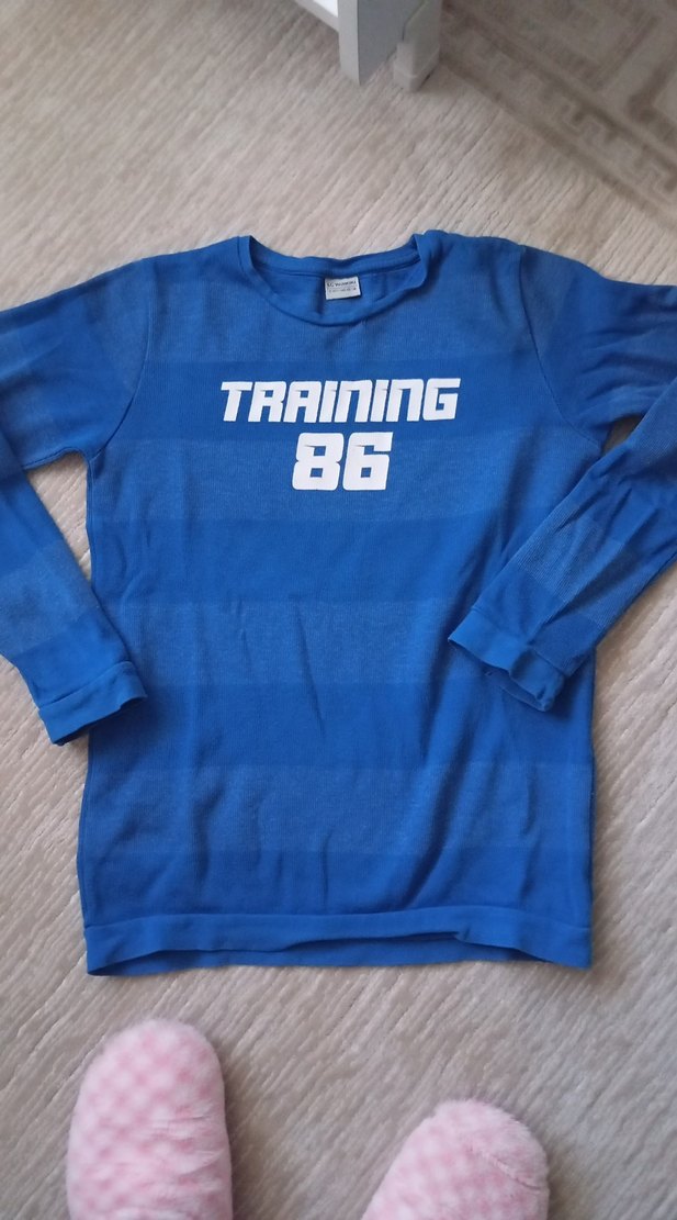 Mavi, uzun kollu ve bisiklet yaka, renkli baskılı 'TRAINING 86' yazılı erkek çocuk sweatshirtü. Yumuşak ve sıcak örme kumaştan yapılmıştır.