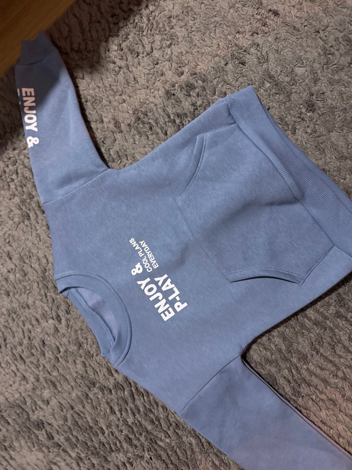 Mavi renkli, uzun kollu, bisiklet yaka ve bol kesim erkek çocuk sweatshirtüdür. Baskılı yazılar ve kollarda cırt cırt detayları bulunur. Yumuşak ve sıcak polar kumaştan üretilmiştir.