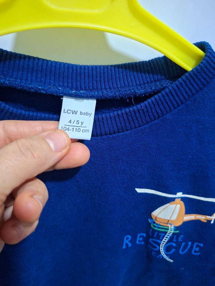 Mavi renkli, uzun kollu ve bisiklet yaka erkek çocuk sweatshirtü, yumuşak kumaştan üretilmiş. Renkli baskılı ve cırt cırtlı detaylı, rahat kesim. 4/5 yaş, 104-110 cm.
