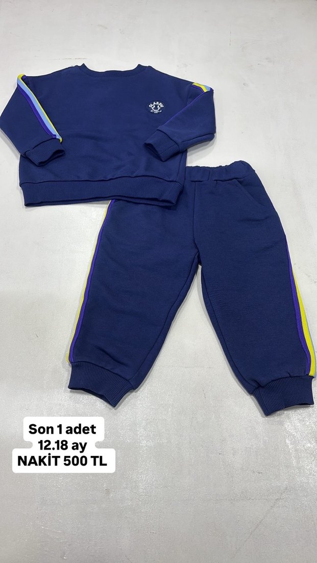 Mavi renkli, bol kesim sweatshirt ve eşofman takımı. Yuvarlak yaka, renkli yan şeritler ve cırt cırt detaylı, rahat ve sıcak kumaştan üretilmiştir.