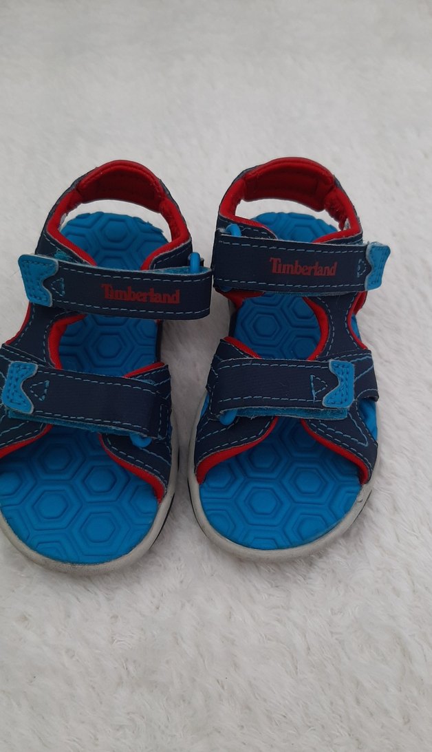 Renkli mavi Timberland marka, kayışlı tokalı erkek çocuk sandaletleri. Rahat kauçuk taban ve sokak stili sunar.