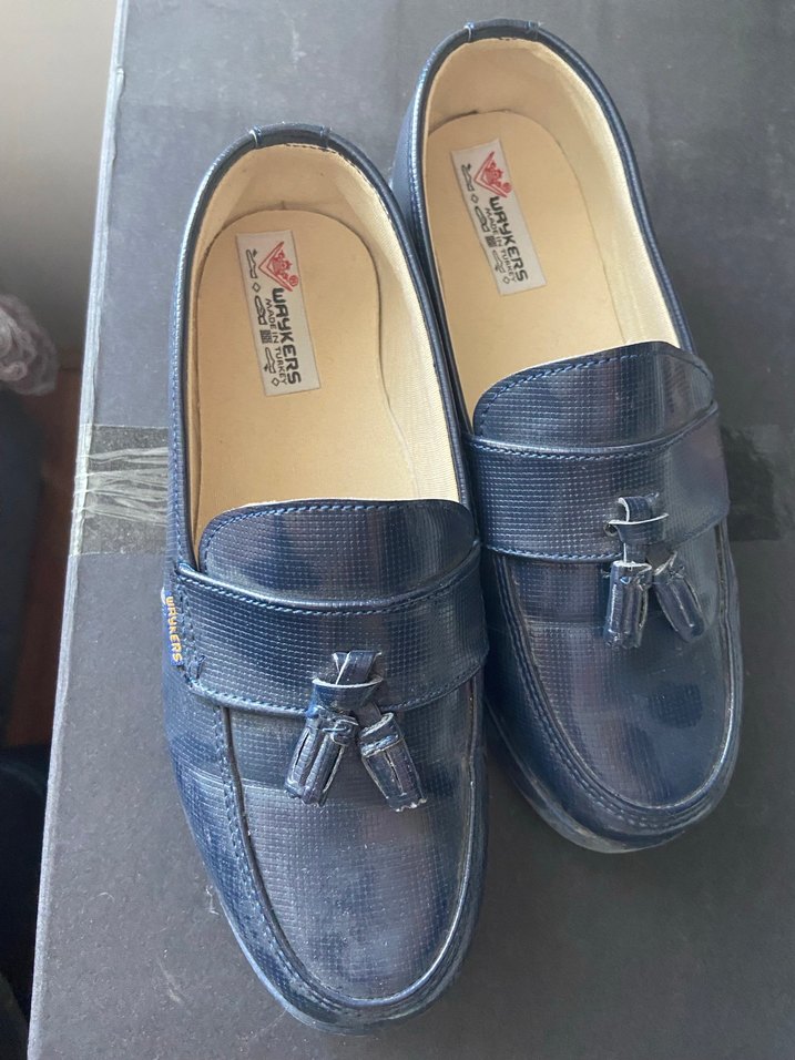Gri tonlarda, dayanıklı kauçuk malzemeden yapılmış, tokalı ve klasik tarzda mavi erkek çocuk loafer ayakkabı. Desensiz sade tasarım.
