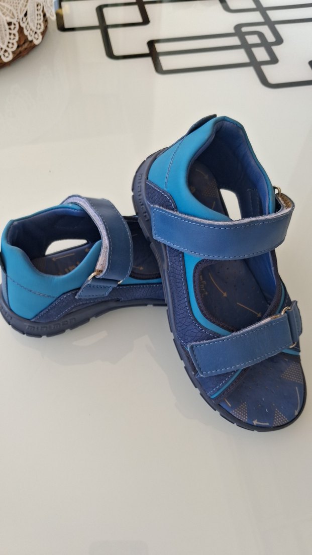 Mavi renkte, tokalı ayarlanabilir bantlara ve dayanıklı kauçuk tabana sahip erkek çocuk sandaletleri. Rahat ve renkli, günlük sokak giyimi için uygun.