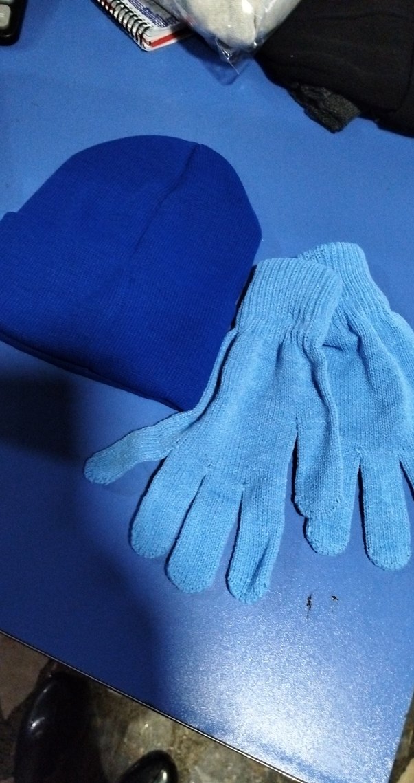 Mavi bere ve açık mavi triko eldivenlerden oluşan yumuşak ve sıcak kumaştan set. Erkek çocuklar için sade ve desensiz.