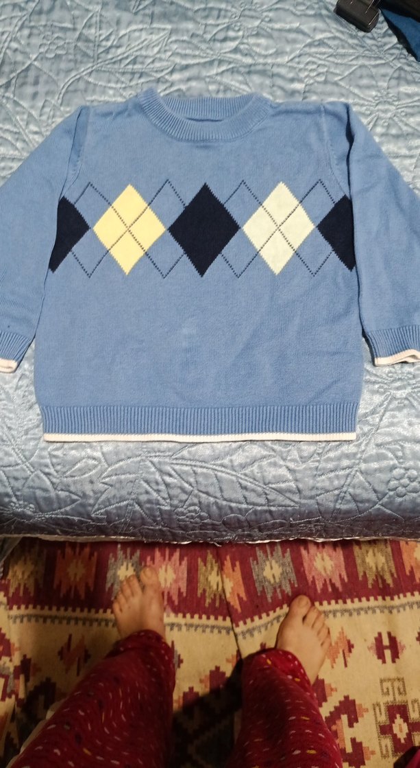 Mavi renkli, uzun kollu, triko kumaştan erkek çocuk kazak. Üstünde klasik argyle desenler bulunur, bol kesim ve bisiklet yaka ile rahat bir modeldir.