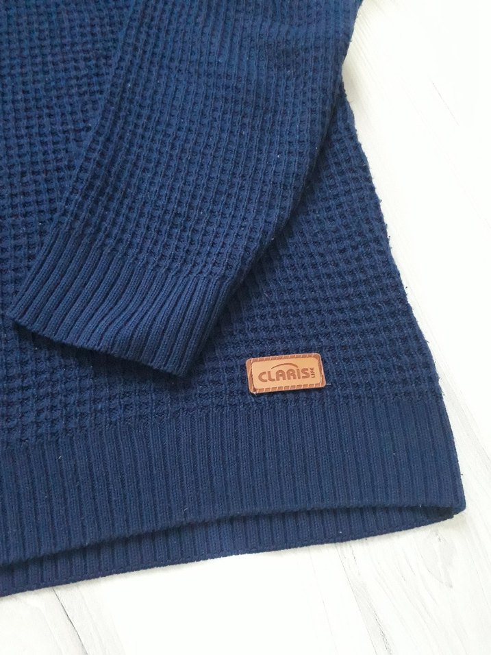 Mavi renkli, uzun hiç kullanılmamış yuvarlak yakalı, dokuma örgü erkek çocuk kazağı. Düzenli kesim ve CLARIS etiketiyle sade tasarım.