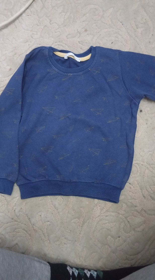 Erkek çocuklar için uzun kollu, yuvarlak yakalı sweatshirt. Yumuşak fleece kumaştan, bol kesim ve gri örgü kağıt uçak desenli.