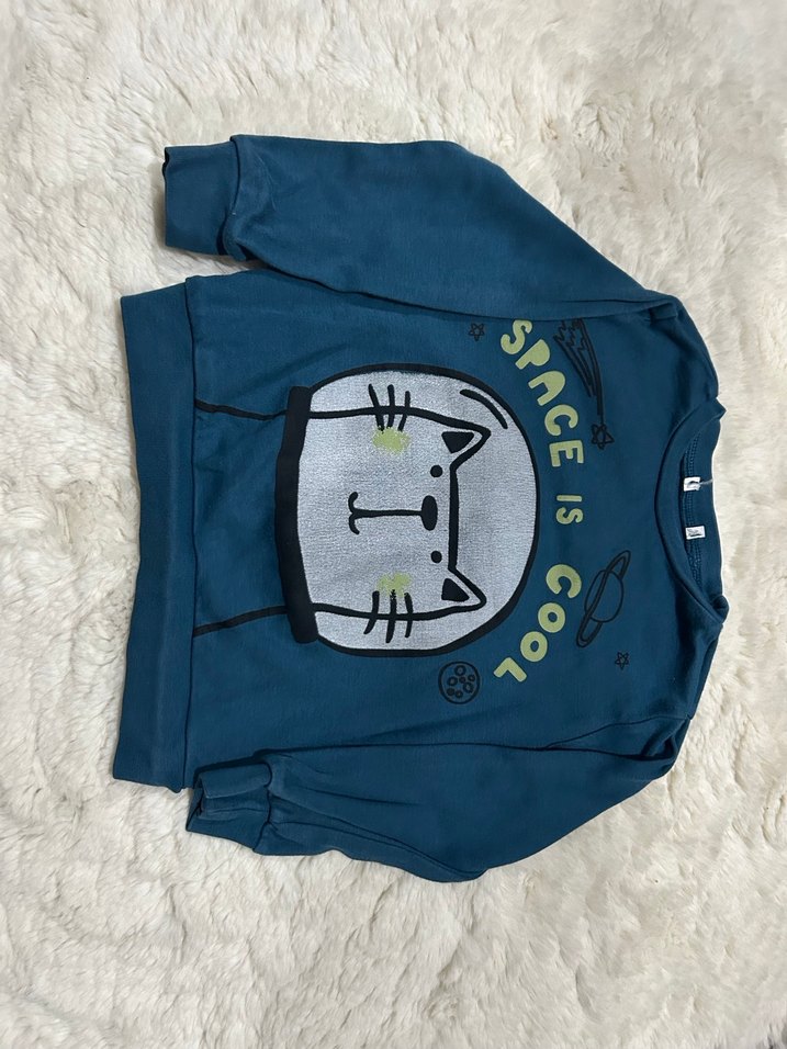 Mavi renkli, uzun kollu, bol kesim erkek çocuk sweatshirtü. Uzay temalı baskı ve kürk detayları bulunur. Yumuşak ve sıcak kumaştan üretilmiştir. 2-3 yaş diyor ancak bence 3 yaşa küçük olabilir.