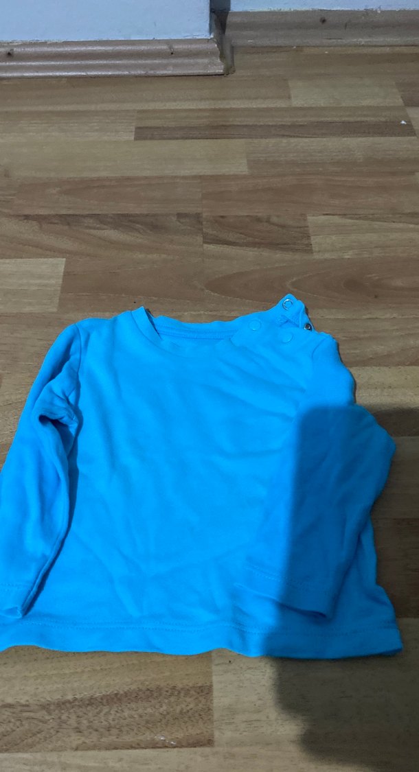 Mavi renkli, uzun kollu erkek çocuk tişörtü, yuvarlak yaka ve bol kesimlidir. Yumuşak ve sıcak kumaştan üretilmiş, omuzda çıtçıt detayına sahiptir.