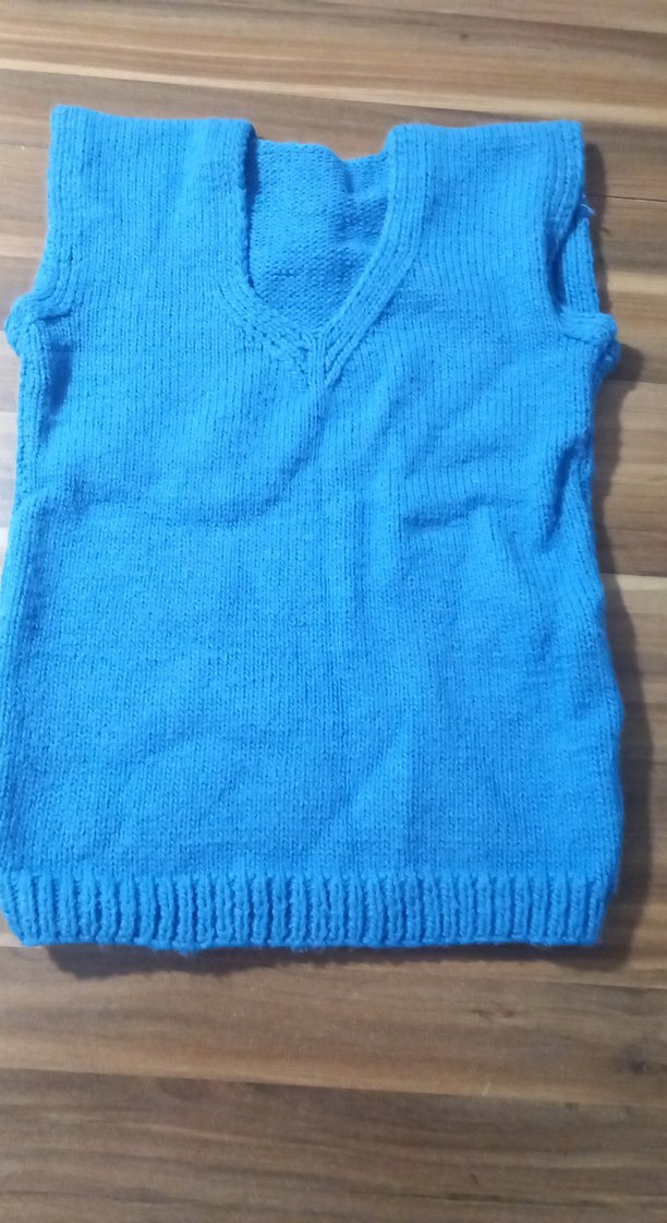 Mavi renkli, V yaka, kolsuz ve dar kesim örme erkek çocuk süveter. Düz ve desensiz tasarımıyla temel ve normcore stil için uygundur.