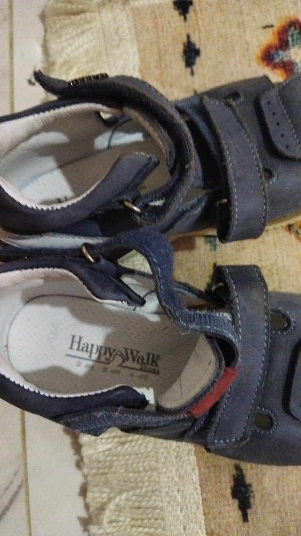 Mavi ve gri renklerde baskılı, Velcro bantlı erkek çocuk terlikleri. Dayanıklı kauçuk malzeme ve rahat sokak stili sunar. İç kısmında "HappyeWalk" yazısı bulunur.
