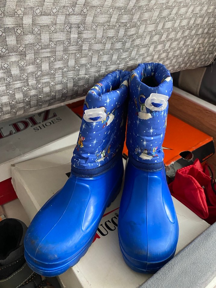 Mavi kauçuk erkek çocuk botları, yıldız desenli renkli kumaş üst kısmı ve kolay giyilen Velcro kapatma özelliği ile. Yağmur çizmesi