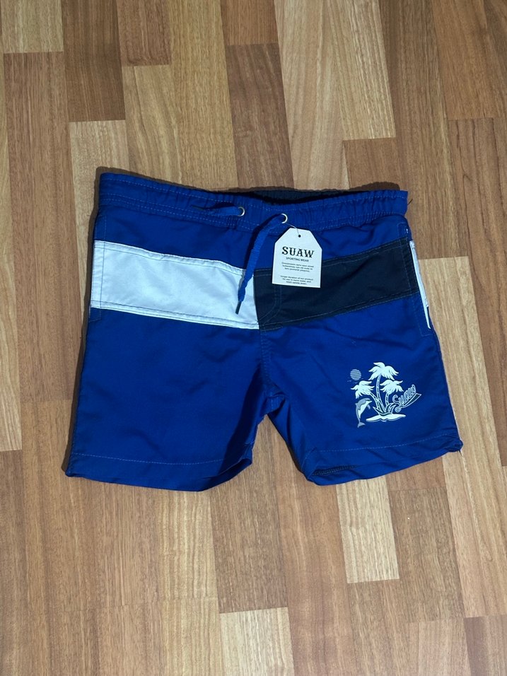 Koyu mavi renkli, palmiye baskılı ve renk bloklu erkek çocuk yüzme şortu. Ayarlanabilir bağcıklı bel. Marka etiketi SUAW.