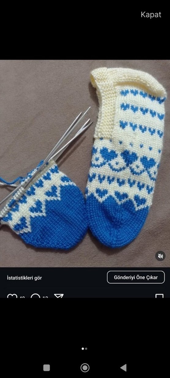 Mavi ve krem renklerde kalp desenli, örme erkek çorabı. Yumuşak ve sıcak kumaş.