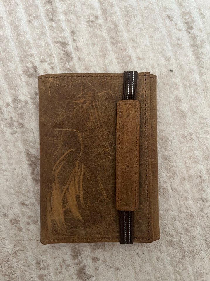 Kahverengi, aşınmış görünümlü erkek cüzdanı. Orijinaldir. Hiç kullanılmamıştır.