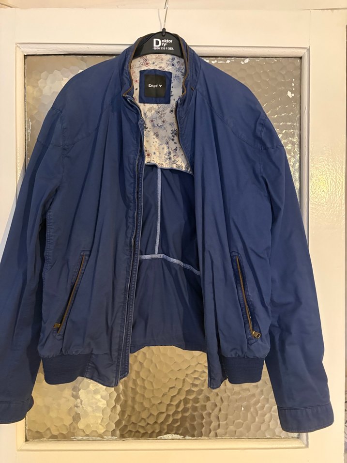 Fermuarlı, mavi denim erkek ceket. Notch yakalı, uzun kollu ve midi boyda. Günlük sokak stili için uygun, rahat kesim.