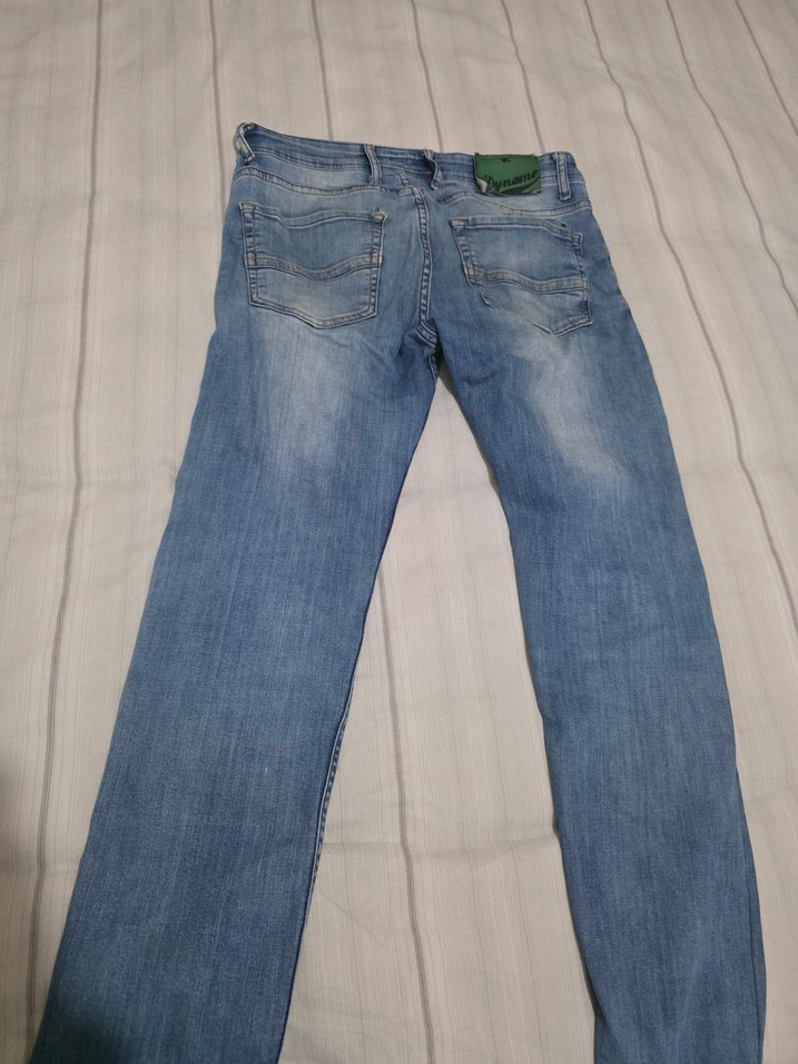 Mavi renkli, kemerli ve normal boyda, rahat kesim erkek denim jean pantolon. Günlük sokak stiline uygun.