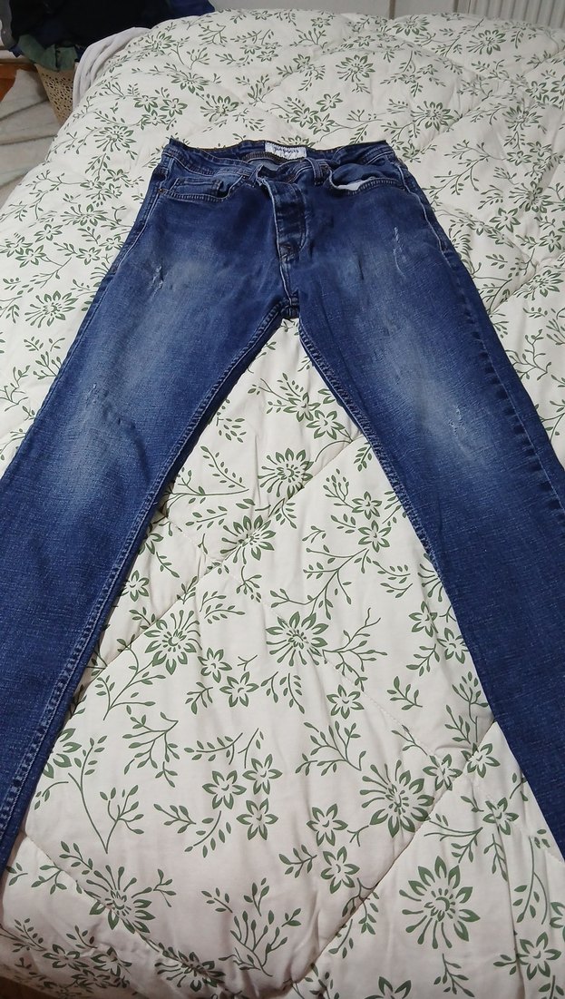 Mavi renk, düğmeli erkek denim jean pantolon. Regular fit ve normal boyda, hafif tie-dye desenli, günlük ve sokak tarzına uygun.