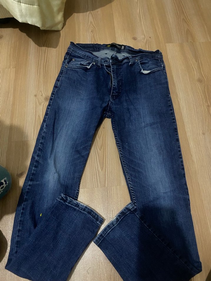 Mavi renkli, parlak görünümlü, tokalı detaylara sahip regular fit denim pantolon. Günlük sokak stili için uygundur.