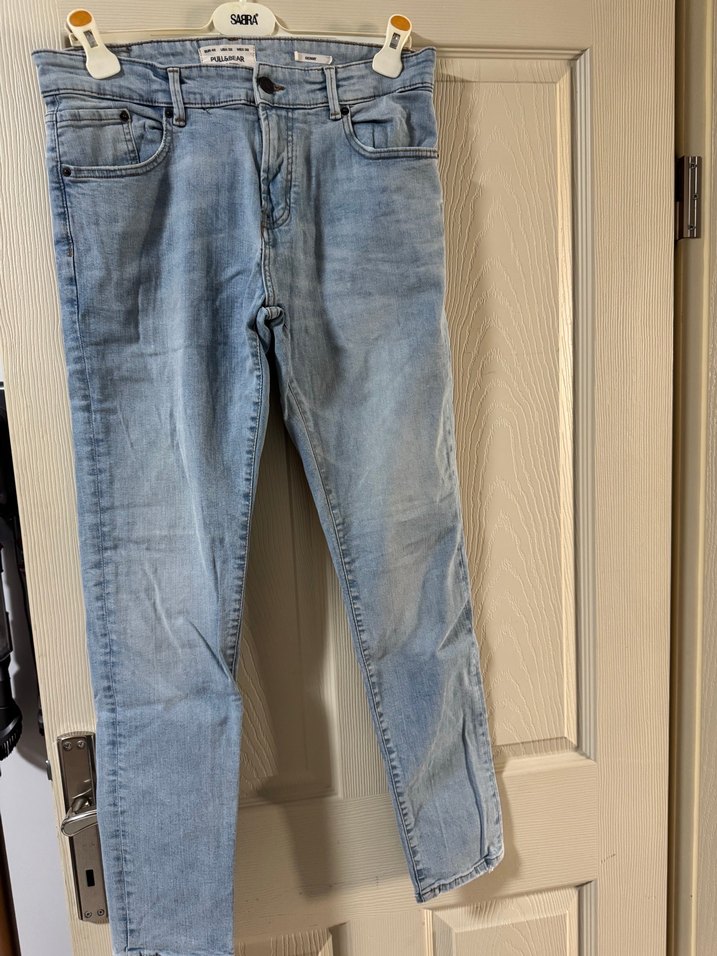 Yumuşak denimden yapılmış, mavi renkte, regular fit erkek pantolon. Midi boy, günlük kullanım için rahat ve şık bir sokak tarzı sunar.