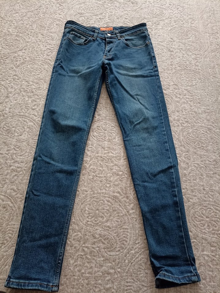 Mavi denim kumaştan, regular fit ve normal boyda, günlük kullanıma uygun sade ve şık kadın pantolonu.