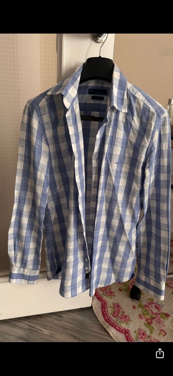 Düğmeli, uzun kollu ve yakalı erkek gömleği. Pamuklu kumaştan, regular fit, mavi ve gri kareli desenli. Günlük sokak giyimi için uygundur.