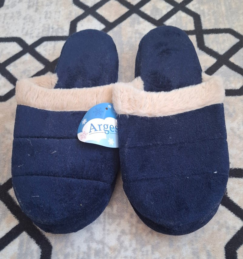 Mavi peluş terlikler, dolgu topuklu ve kürk detaylıdır. Günlük kullanım ve rahat anlar için uygundur. kullanılmadı