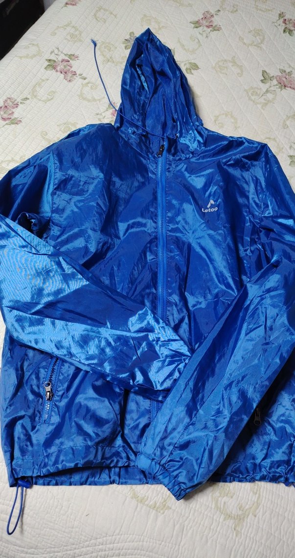 Mavi erkek yağmurluğunda parlak sentetik kumaş, fermuarlı ön, uzun kollu ve kesik yaka bulunur. Rahat kesim ve normal boydadır, dış mekan kullanımına uygundur. ️