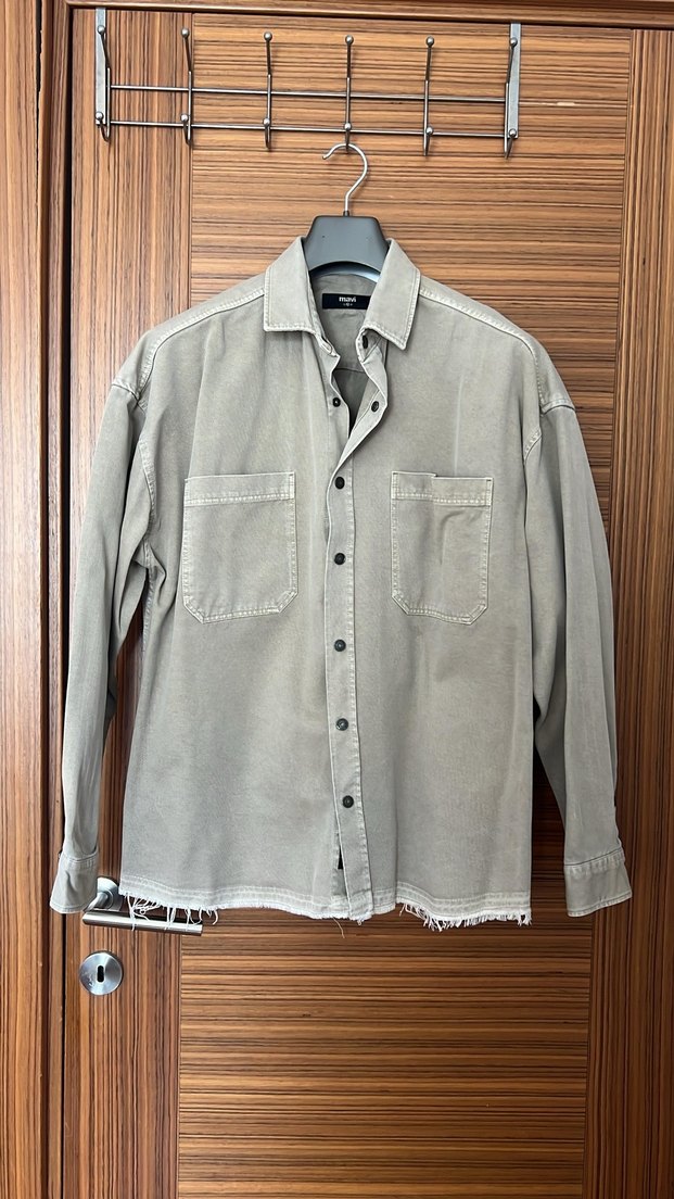 Bej renkli, keten kumaştan yapılmış erkek gömleği, rahat kesim ve uzun kolludur. Düğmeli ön kısmı, kesik yakası ve iki ön cebiyle günlük sokak stiline uygundur.