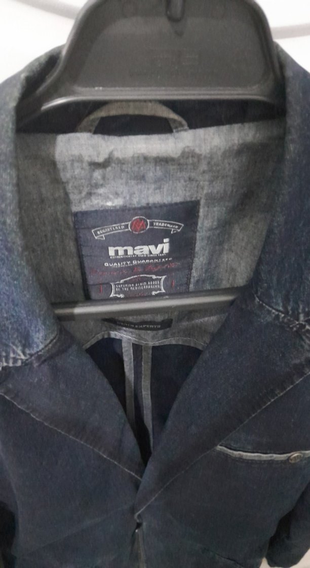 Mavi markalı, gri renkte, erkekler için casual sokak stili ceket. Üzerinde 'mavi' marka etiketi mevcuttur.
