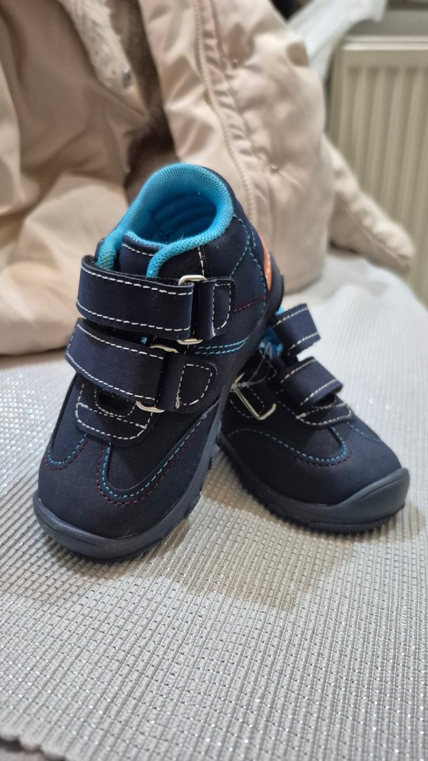 Mavi renkli, velcro bantlı ve kauçuk tabanlı erkek çocuk ilk adım ayakkabısı. Renkli ve desen içermeyen, sokak stili uyumlu. 20 numara hiç kullanılmadı. etiketin kağıt kısmı yok sadece etiketi bağlamaya yarıyan aparatı duruyor