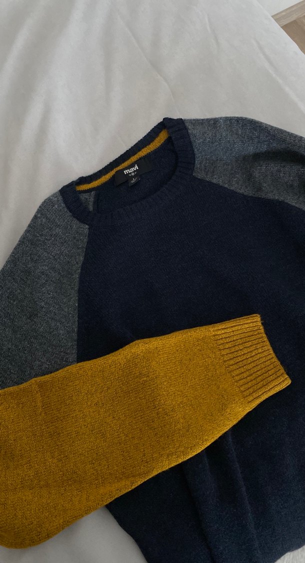 Erkekler için yünlü, yuvarlak yaka ve uzun kollu kazak. Gri, lacivert ve hardal renk bloklu, rahat kesim ve gündelik sokak stili için uygundur.