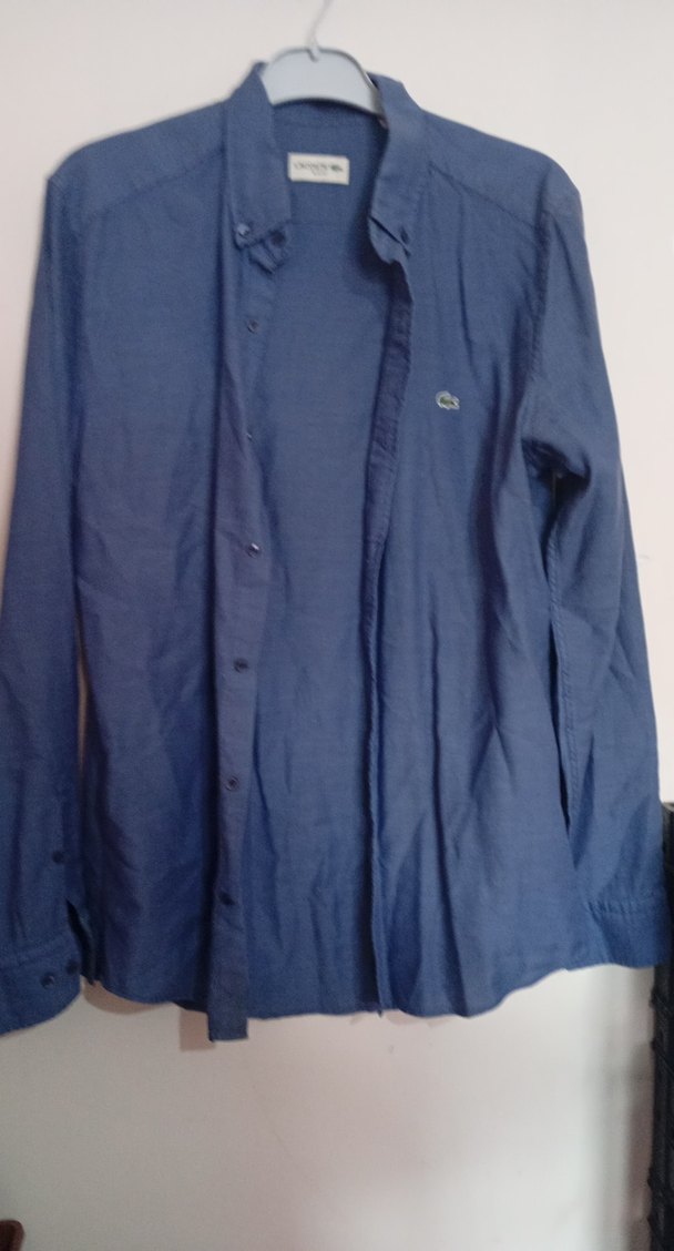 Parlak mavi keten kumaştan, düğmeli ve yakası kesik detaylı, bol kesim erkek gömleği. Uzun kollu ve normal boyda, günlük rahat sokak stili için uygundur.