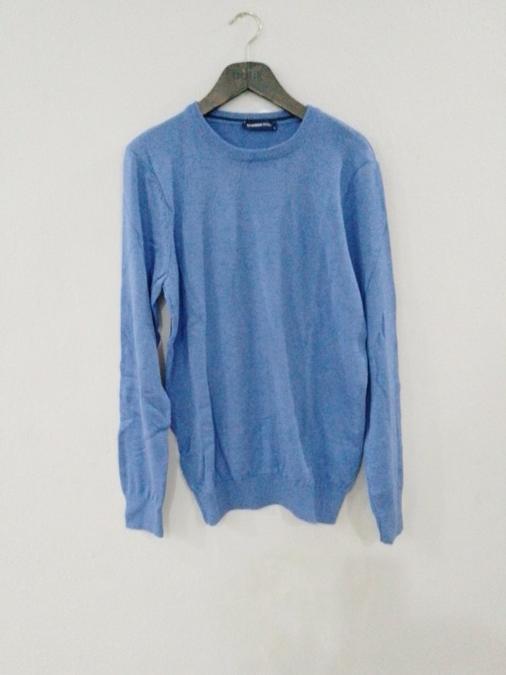 Mavi pastel renkte, keten kumaştan, uzun kollu ve bisiklet yaka erkek kazak. Salaş kesimiyle rahat bir günlük sokak stili sunar.