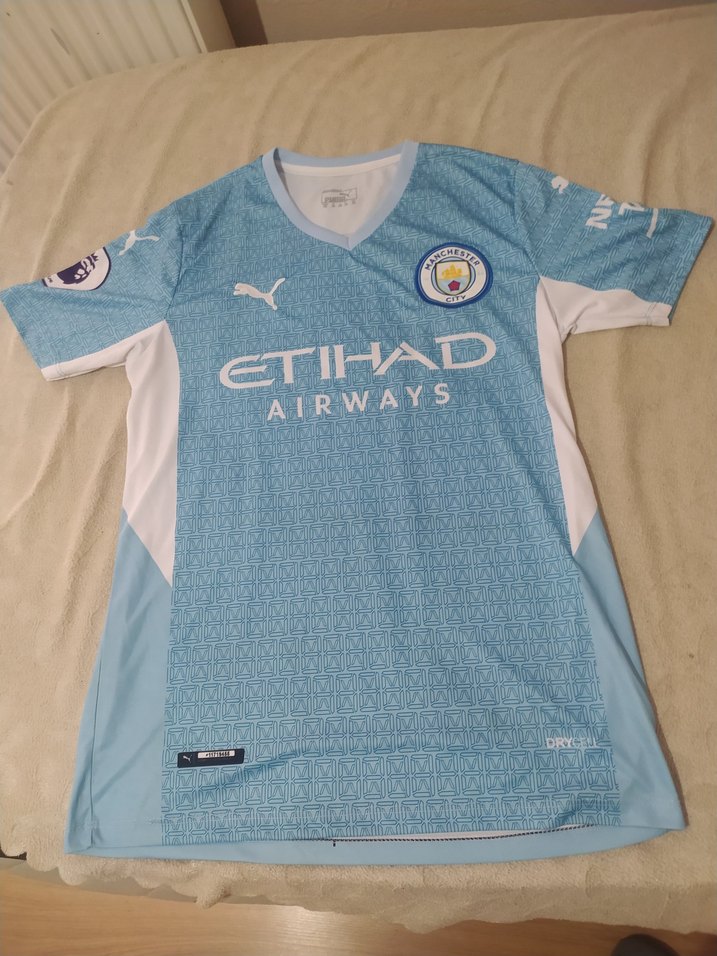 Mavi renkli, kısa kollu ve bisiklet yaka erkek forma, yumuşak sentetik kumaştan, vücuda oturan kesimde. Düğme detaylı ve baskılı desenli, gündelik spor tarz için uygun. Üzerinde 'ETIHAD AIRWAYS' baskısı bulunur. ⚽