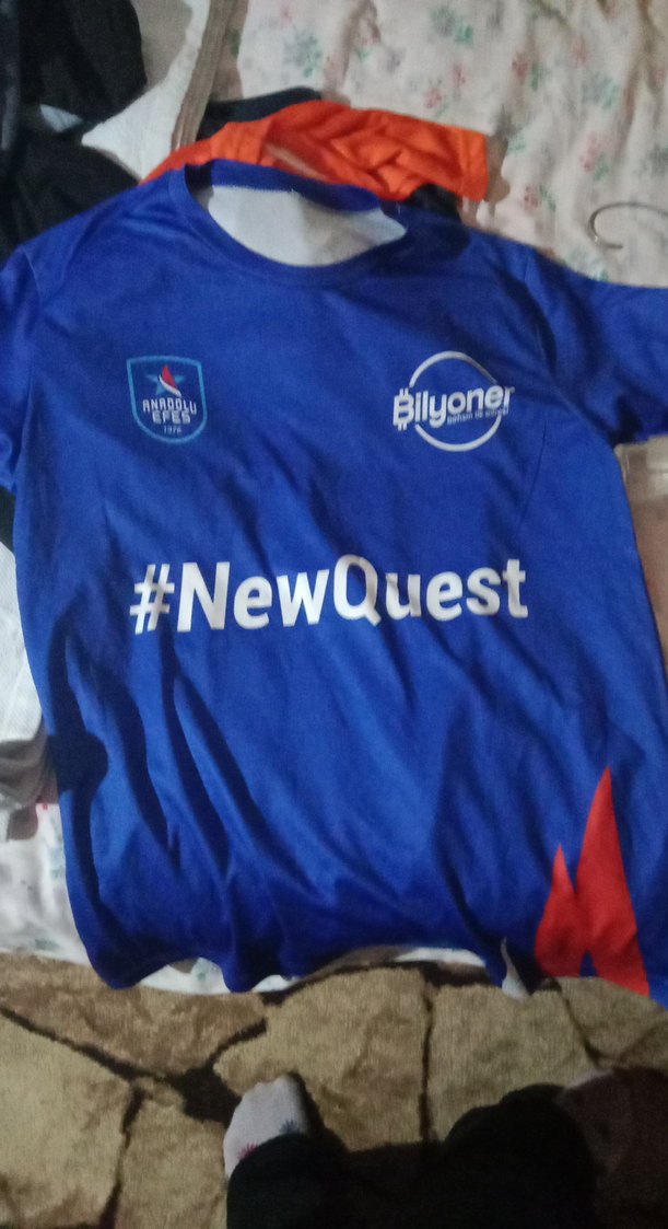 Mavi renkli, kısa kollu ve düğmeli erkek spor formas Yumuşak ve sıcak kumaştan, baskılı #NewQuest yazısı bulunur. Spor ve sokak giyimine uygun.