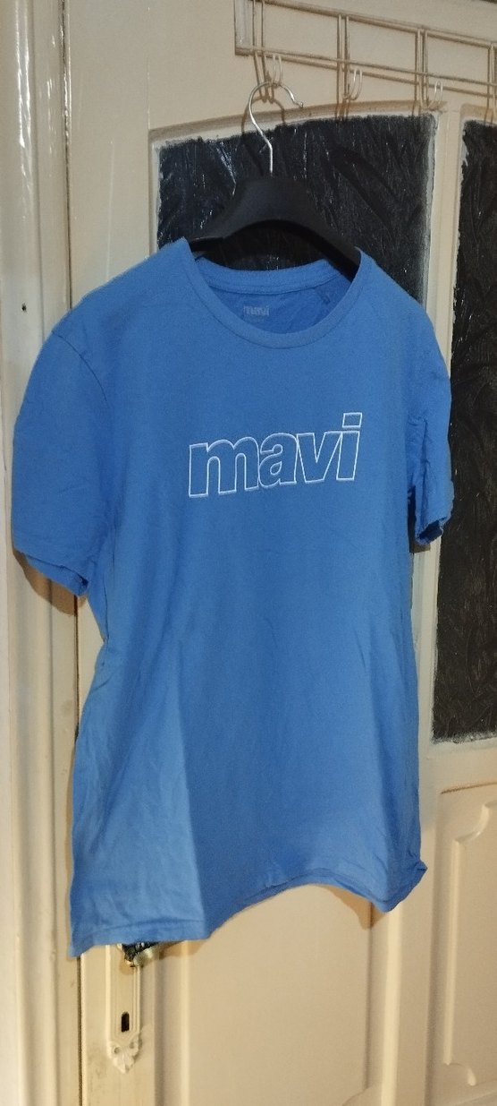 Mavi renkli, baskılı 'mavi' yazılı, rahat kesim, kısa kollu, yuvarlak yaka erkek tişörtü.