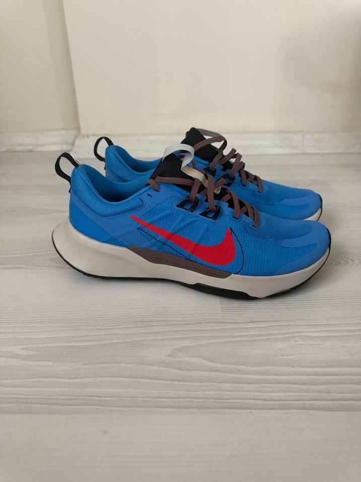 Mavi renkli, baskılı desenli erkek koşu ayakkabısı. Kırmızı detaylar ve koyu bağcıklarla, kauçuk tabanlı, sportif ve şık görünümlü.