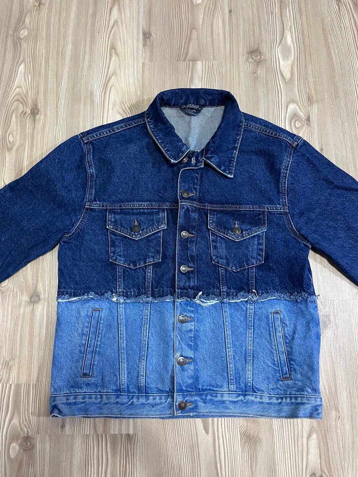 Düğmeli, parlak mavi renkte, yakalı ve uzun kollu unisex kot ceket. Rahat kesimiyle günlük sokak stiline uygundur.