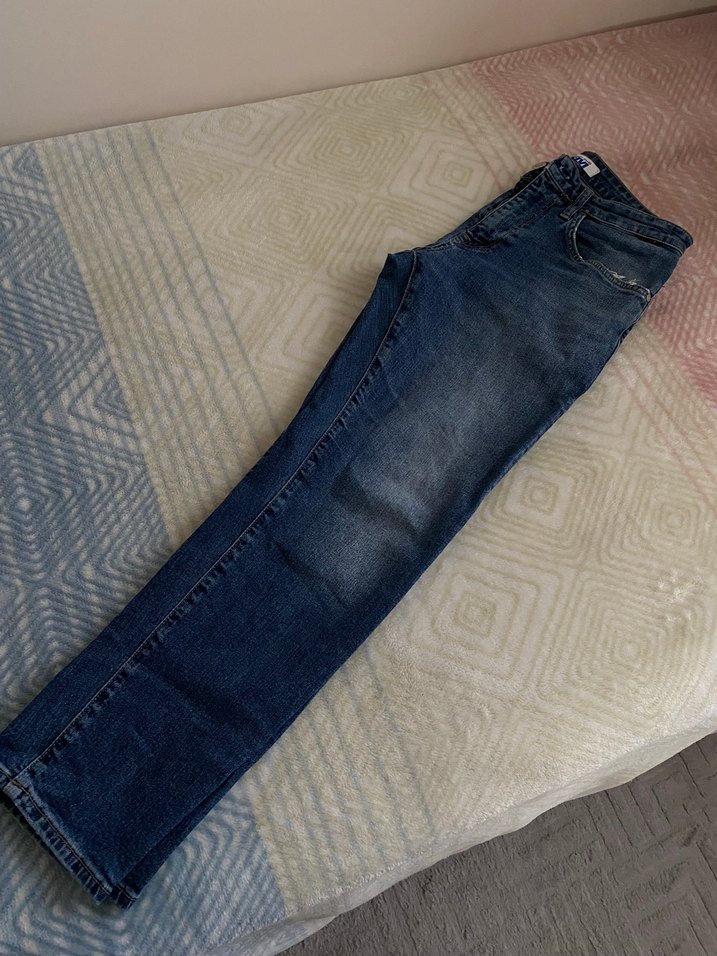 Mavi denim kumaştan, düzenli kesim ve normal boyda kot pantolon. Gri tokası ve desensiz sade tasarımıyla günlük kullanıma uygundur.