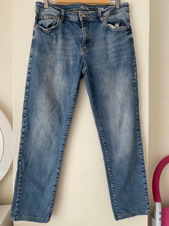 Kadınlar için mavi pastel tonlu, bol kesim ve normal boy kot pantolon. Düz desensiz, tokalı detaylı, günlük kullanıma uygun.