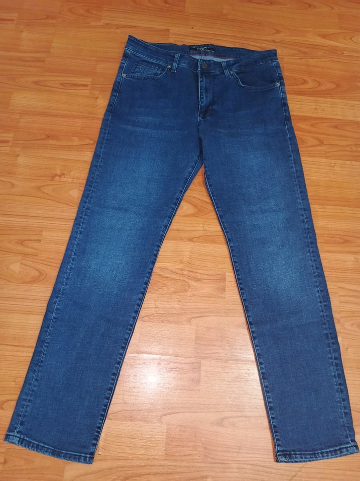 Mavi, regular fit erkek kot pantolon. Denim kumaştan ve parlak görünümlü, tokalı detaya sahip, günlük sokak tarzı için uygun.