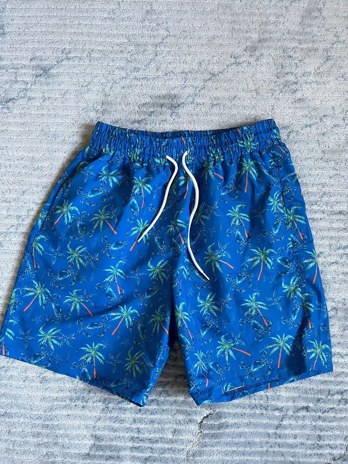 Renkli palmiye desenli, elastik bel ve bağcıklı mavi erkek mayo şort.Hiç giyilmedi.Sıfır ürün. Polyester kumaştır. M bedendir.Bel uzunluğu 35cm,boydan 44cm’dir.