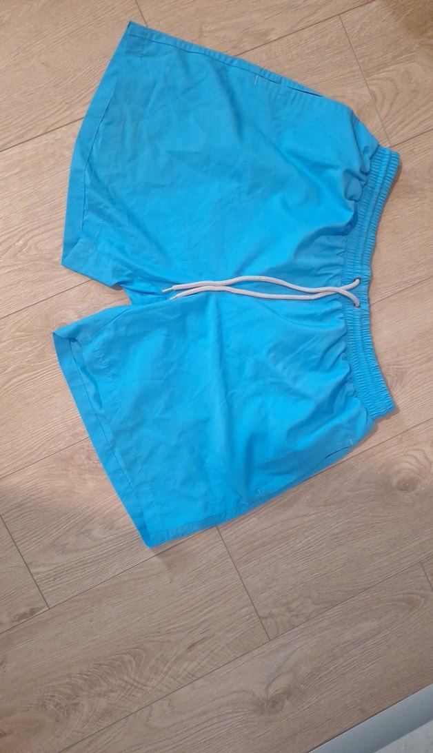 Renkli mavi, bol kesim erkek mini şort mayo, lastikli bel ve bağcıklı, plaj için uygun.