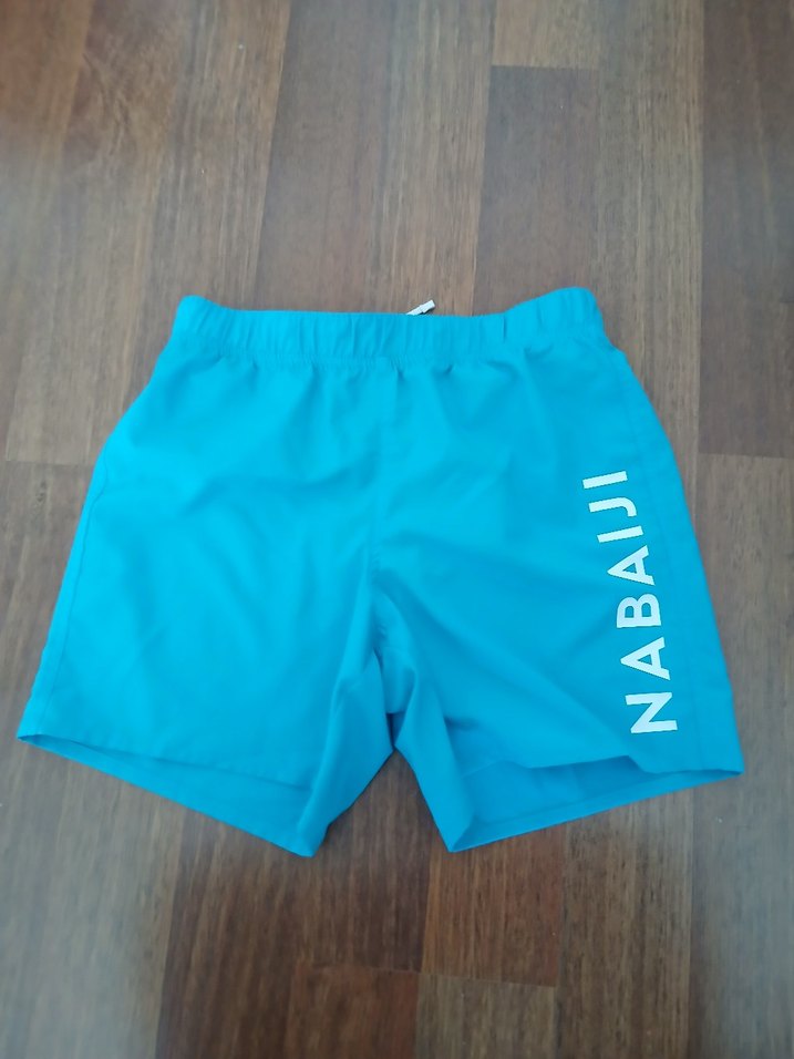 Yanında "NABAIJI" yazısı bulunan, sade tasarımlı mavi erkek mini yüzme şortu. Renkli ve zahmetsiz şıklık sunar.